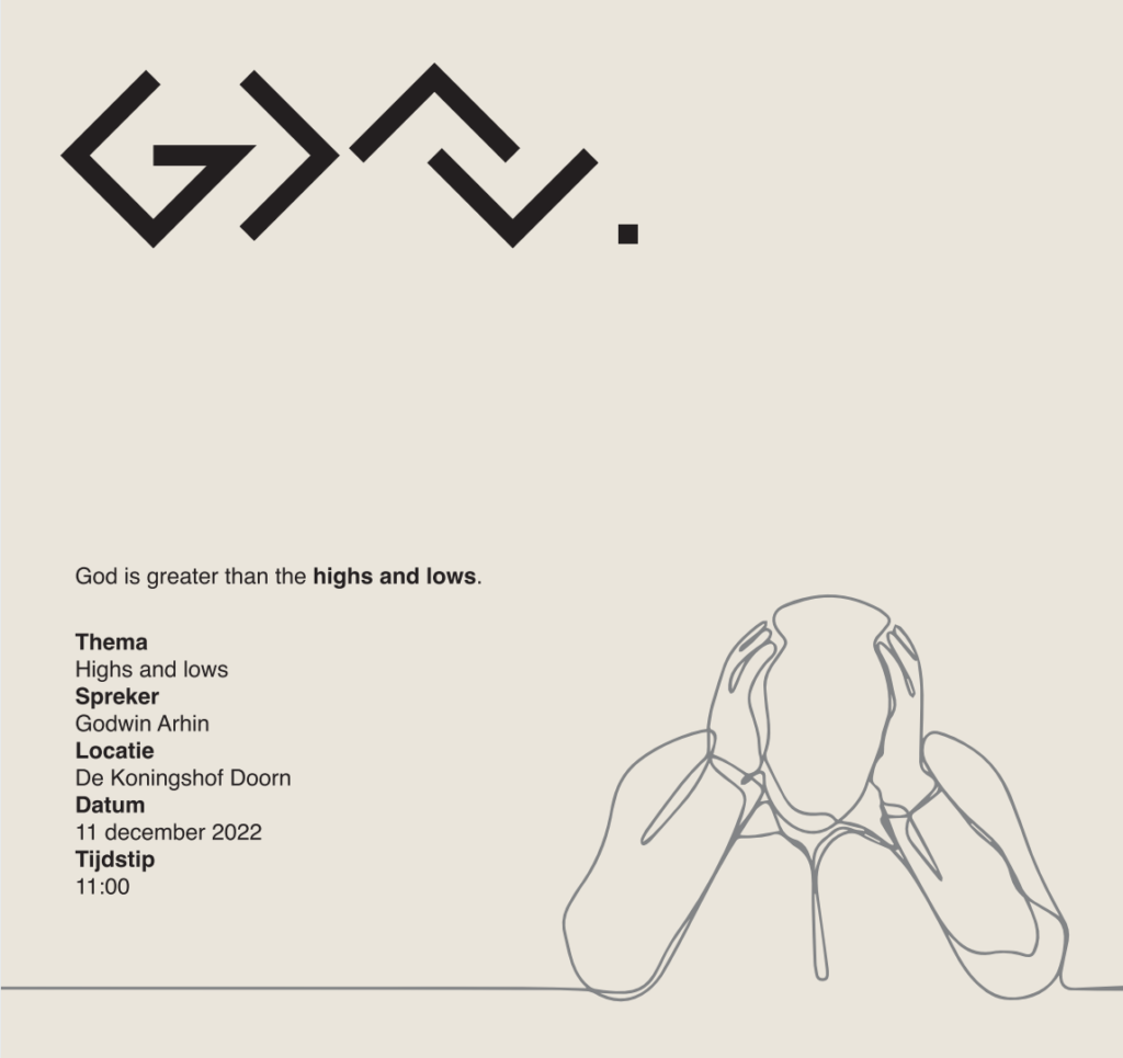 Zondag 11 december ben je welkom om mee te doen met onze jeugddienst. Het thema is God is greater that the highs and lows. Godwin Arhin zal deze ochtend spreken. Je vind de details zoals adres en tijdstippen in de agenda en op de flyer.