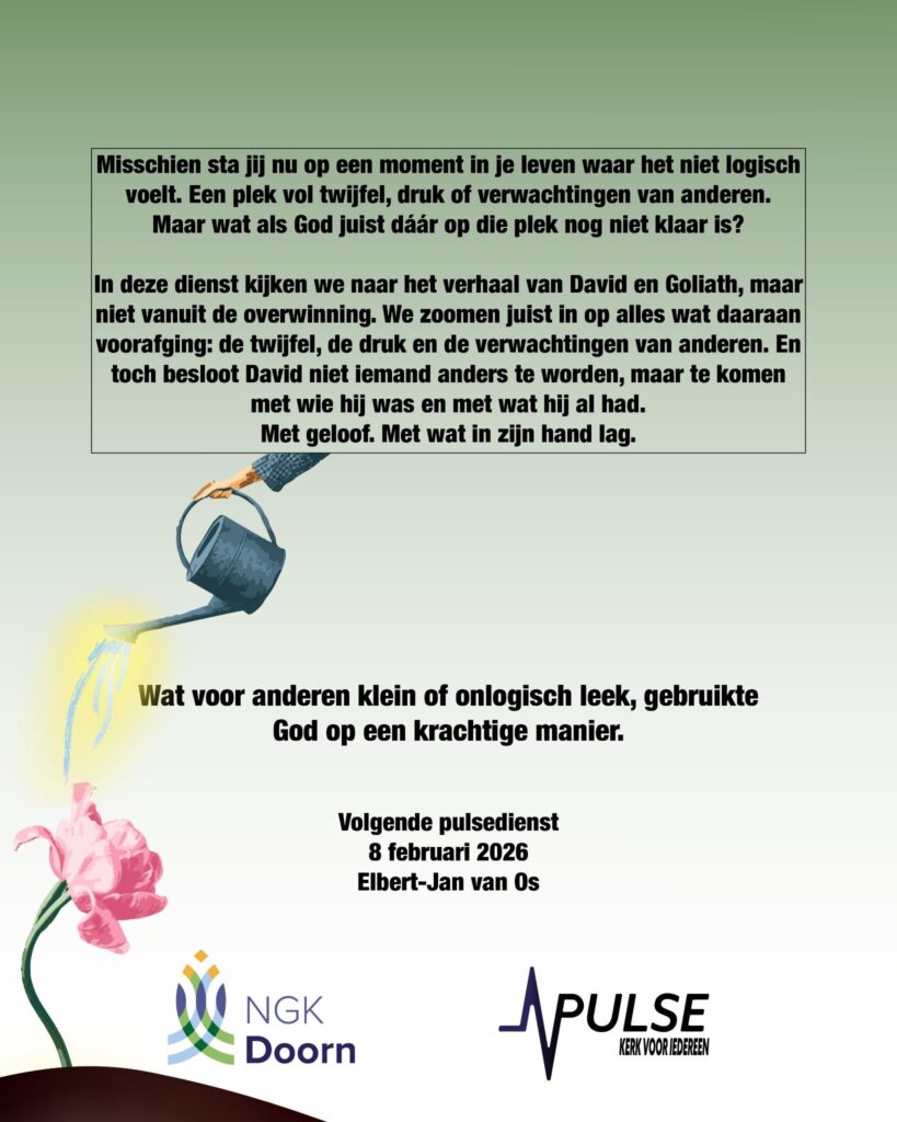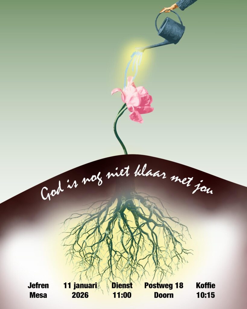 Het thema van deze dienst is: ‘God is nog niet klaar met jou ‘. Jefren Mesa kijkt in deze dienst met ons naar het verhaal van David en Goliath, maar niet vanuit de overwinning. We zoomen juist in op alles wat daaraan voorafging; de twijfel, de druk en de verwachtingen van anderen. En van daaruit zien we dat wat voor anderen klein of onlogisch leek, God op een krachtige manier gebruikte. De dienst begint om 11:00 (koffie 10:15). In de Kapel, Postweg 18 Doorn.